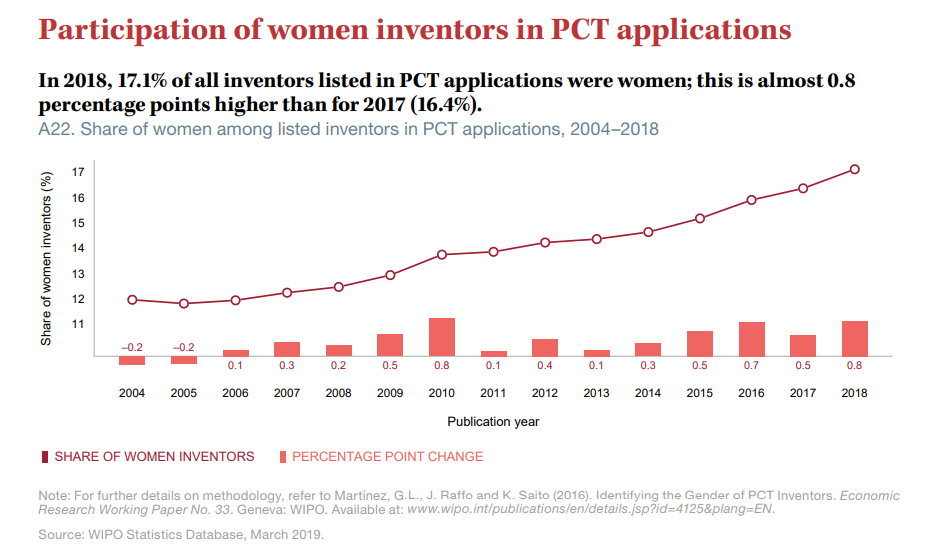 Según los datos que acaba de hacer públicos la Organización Mundial de la Propiedad Intelectual (OMPI) en su informe anual, si bien el número de mujeres que aparecen como inventoras en las solicitudes internacionales PCT sigue creciendo, aún solo representa un 17% del total. Los datos muestran una tendencia al alza sin duda prometedora, pero nos señalan el largo camino que aún nos queda por recorrer.