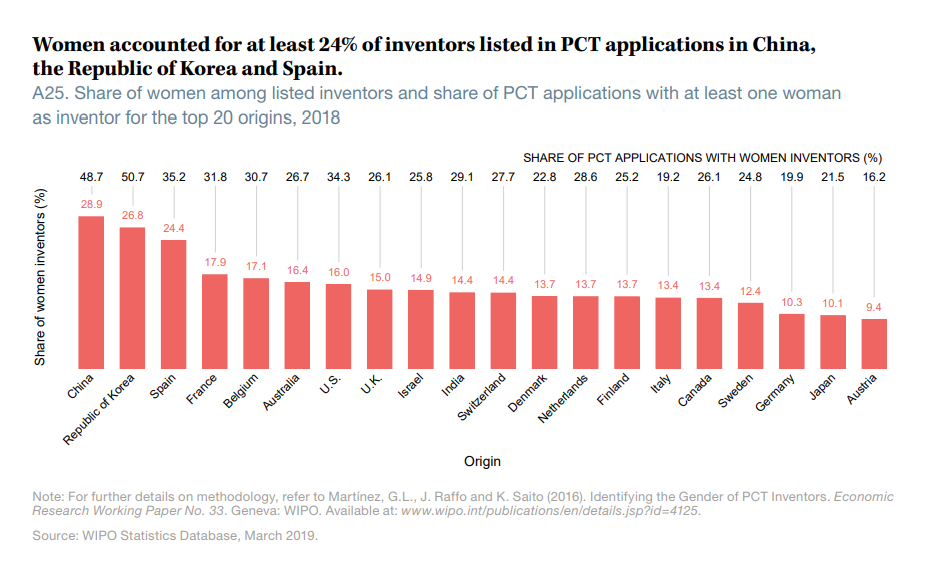 Un dato a destacar es el porcentaje de mujeres entre los inventores de las solicitudes internacionales PCT con origen en España. Este supera con creces la media, situándose en un 24%. Según esta misma fuente, en más del 35% de las solicitudes presentadas participan mujeres como investigadoras.