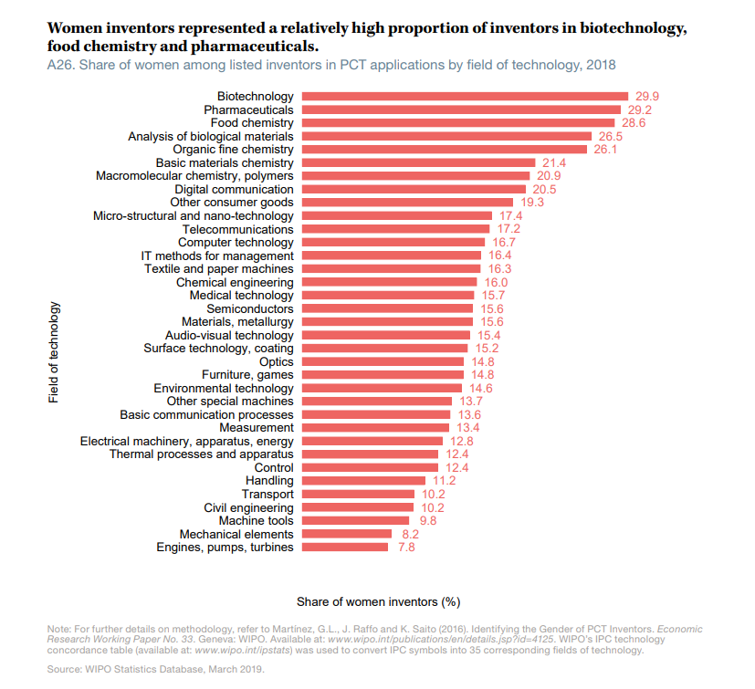 Las patentes son solo uno de los muchos parámetros con los que podemos medir la contribución y representación actual de las mujeres en la ciencia. Aún así, puede darnos interesantes pistas sobre las tendencias generales. Este informe señala que las áreas donde hay mayor porcentaje de mujeres inventoras son la biotecnología, farmacia, tecnología de los alimentos, análisis de materiales biológicos y química orgánica. Mientras tanto, otras áreas del conocimiento más ligadas a la ingeniería, en especial a la mecánica, quedan relegadas a los últimos puestos.